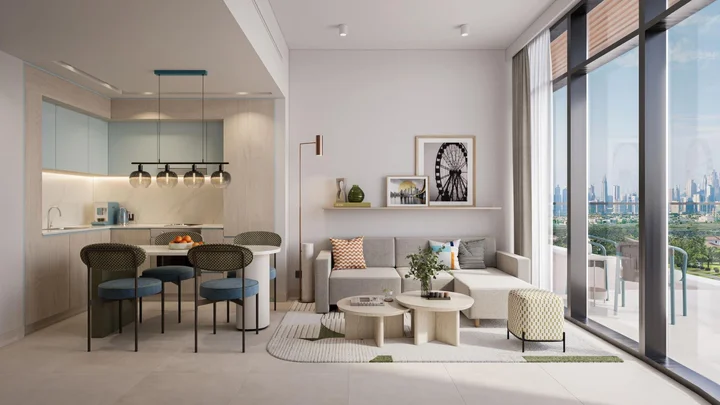 Each unit comes with a terrace offering lagoon or boulevard views. The kitchens are equipped with premium appliances, and the entire furnishing package reflects Rove’s hotel-inspired, uncluttered style.