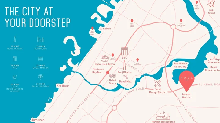 Rove Home sits in Meydan Horizon, a fast-growing district within MBR City featuring lagoons, canals, parks, retail, and future mega attractions like Meydan One Mall with its indoor ski slope. The tower has direct access to Dubai–Al Ain Road and Ras Al Khor Road.