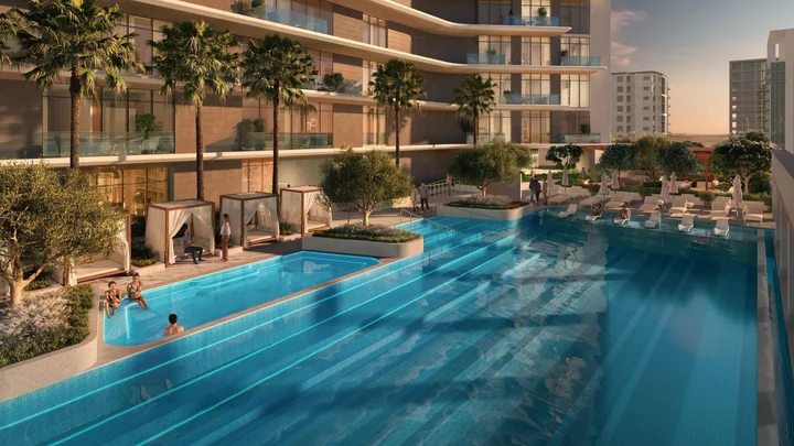 Positioned within a major waterfront community, the tower overlooks a crystal lagoon, a 4-km canal, and Dubai’s skyline.