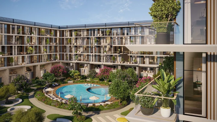 The exterior design is modern and clean, with stone and wood-inspired details. Full-height glass windows bring in natural light and give the building a strong visual identity. At the center, there is a landscaped courtyard with a circular pool, seating areas, and greenery that creates a calm and private atmosphere for residents.